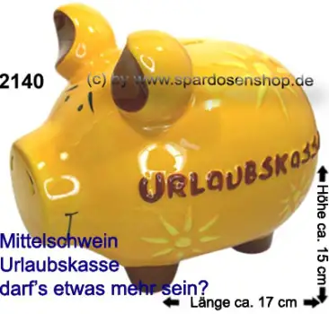 Zur Auswahl steht hier eines, oder auch gleich mehrere der wie auf den Fotos abgebildeten Größenvariante eines neuen Sparschwein. Sparschweine mit 3D Design "Urlaub" oder "Urlaubskasse", Hauptfarbe gelb, mit modernen KCG Design aus Keramik, ausgestattet mit einem Spardosenstopfen, unter den Standflächen mit Filzaufklebern.