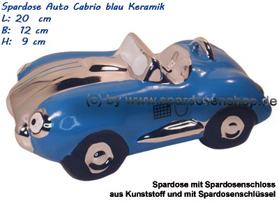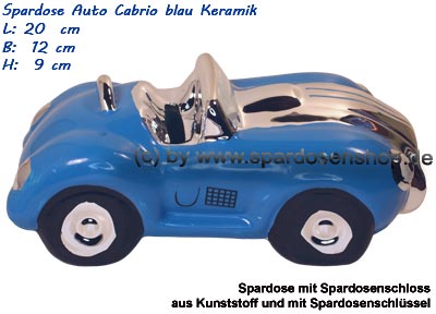 Die Spardose Auto Cabrio blau aus Keramik, hier in der Farbe Blau / Chrom / Bunt (wie auf den Fotos) wird Ihnen mit einem Spardosenschloss & Schlüssel angeboten. Im Shop bieten, oder werden wir in Kürze auch weitere Auto Cabrio Spardosen anbieten.