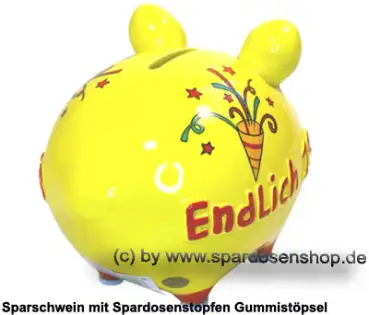 Zum Kauf steht hier, das wie auf den Fotos abgebildete neue Sparschwein. Ein Sparschwein mit 3D Design "Endlich 18", Hauptfarbe gelb, ein modernes KCG Design aus Keramik, ausgestattet mit einem Spardosenstopfen, unter den Standflächen mit Filzaufklebern.
