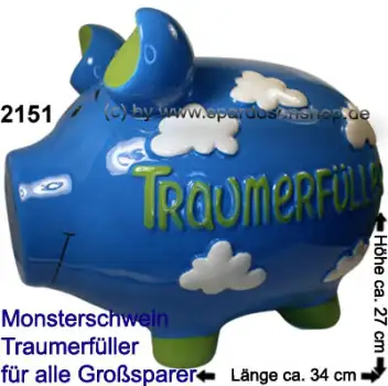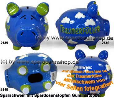 Zur Auswahl steht hier eines, oder auch gleich mehrere der wie auf den Fotos abgebildeten Größenvariante eines neuen Sparschwein. Sparschweine mit 3D Design "Traumerfüller", Hauptfarbe blau, mit modernen KCG Design aus Keramik, ausgestattet mit einem Spardosenstopfen, unter den Standflächen mit Filzaufklebern.