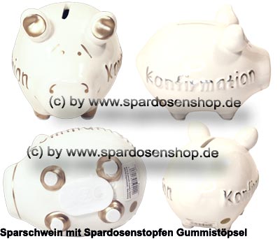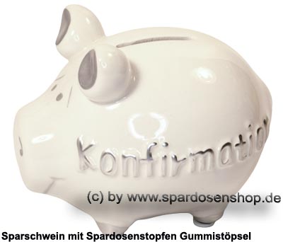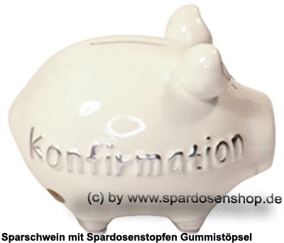 Sparschwein „Konfirmation“ klein – in Weiß – Kleinsparschwein mit Schriftdekor & Gummistopfen